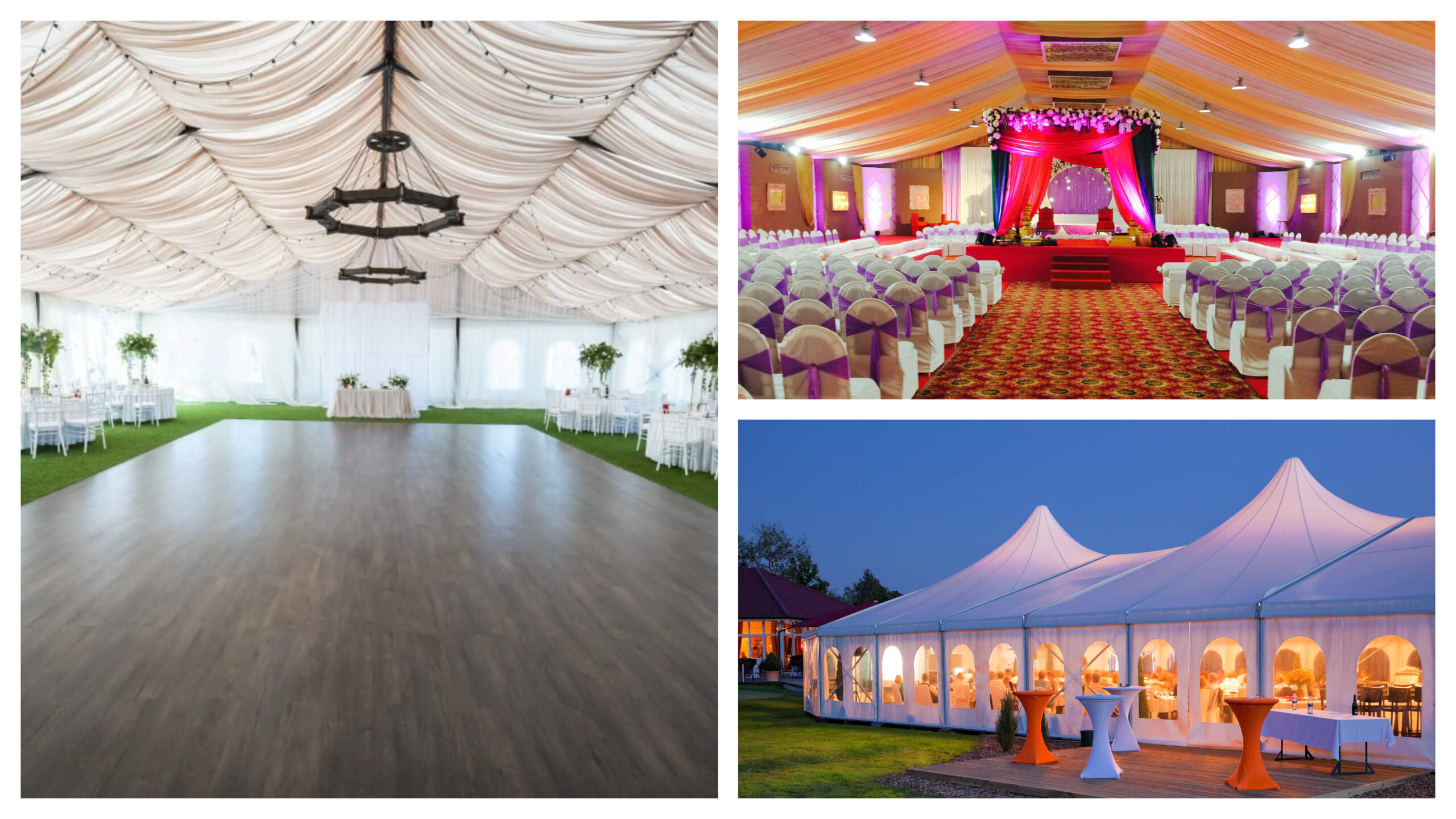 The width of the frame tent ranges from three meters to forty meters. As a module, the length can be increased by 3 meters or 5 meters. The activity organization can increase the length of the mixed tent according to the number of participants, table and chair placement, dance floor and other factors.