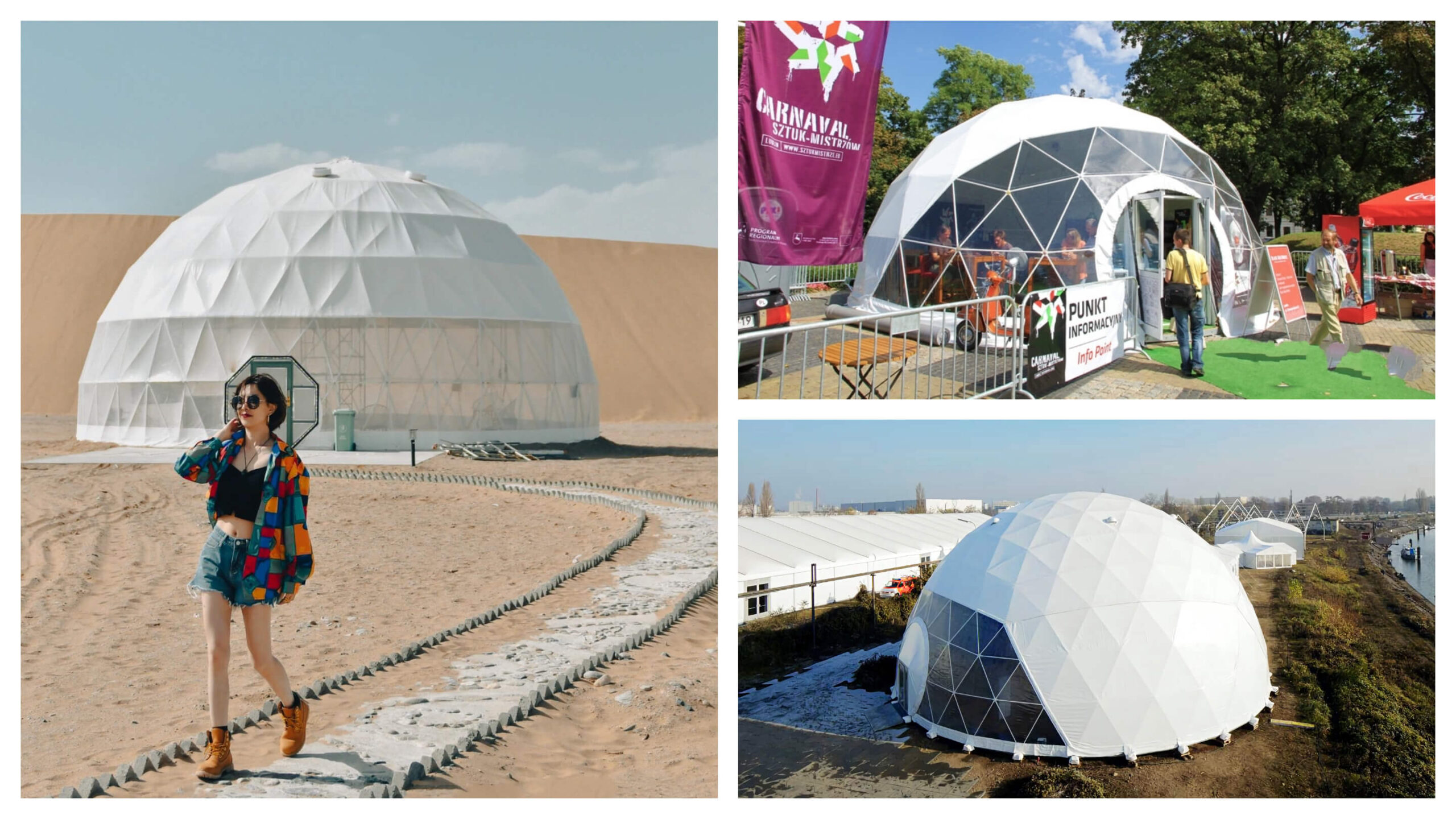 Geodesic dome tent has high strength seamless steel pipe and solid structure, it can resist wind and snow load. The geodesic dome tent adopts 850 grams /©OPVC flame retardant tarpaulin, durable. It has the functions of waterproof and fire prevention, flame retardant and high temperature resistance, ultraviolet protection and so on. Three free opening aluminum alloy doors. With the appearance of fashion, unique style beautiful and elegant characteristics.