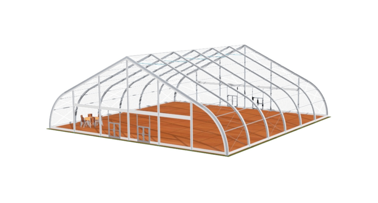 Its innovative aluminum frame is not only lightweight, facilitating transportation of up to 10,000 sq. ft. of structure on a single truck but also versatile, supporting assembly on diverse terrains without necessitating a foundation.